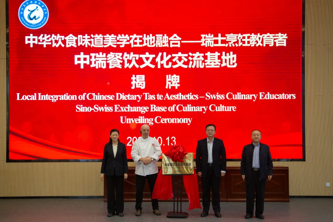 Im Anschluss an die Unterzeichnung folgte ein weiterer Höhepunkt: die Enthüllung der goldenen Tafel. Diese wird künftig auf dem Gelände des Colleges den offiziellen Standort der „Sino–Swiss Culinary Cultural Exchange Base“ kennzeichnen.